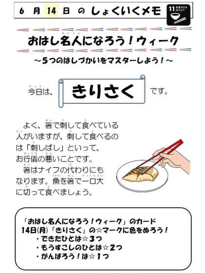 今日から、おはしを正しく持って使える「おはし名人」を目指して、おはしの練習に取り組みます。その取り組みの第1弾が、「おはし名人になろう!ウィーク」です。今日から18日金曜日までの1週間、給食の時間に給食を食べながら5つのはし使いを練習します。