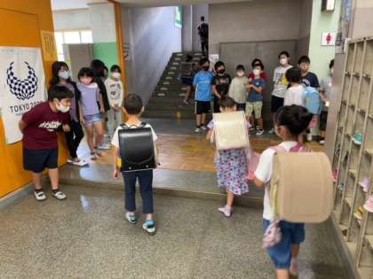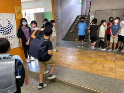 今週は、5年生が昇降口に立って、全校児童を迎えて、あいさつ運動をしています。