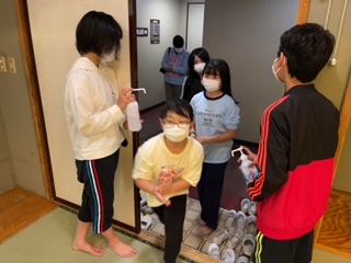 入室前には、しっかり手指消毒します。