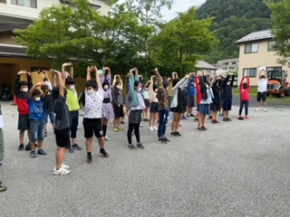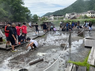 今日は、予定を変更して宿の前で朝の会をしてから源泉に行きました。