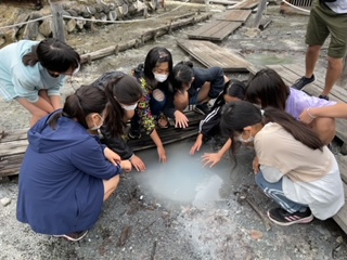 源泉に着いた後はみんなで手を源泉につけてみました。