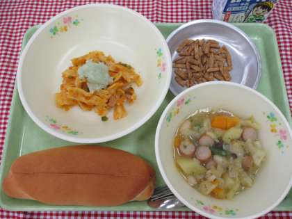 今日は、学校給食と八王子ナポリタン倶楽部のコラボとして、「夏🍅はちナポサンド」をいただきました。