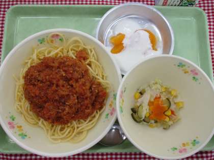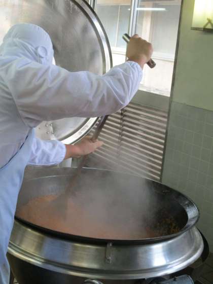 3枚目の画像は、調理員さんがみんなが大好きなスパゲティミートソースを、気合いを入れ、愛情をこめて作っている様子です。野菜の甘みが口いっぱいに広がる、うまみが凝縮されたミートソースでした。