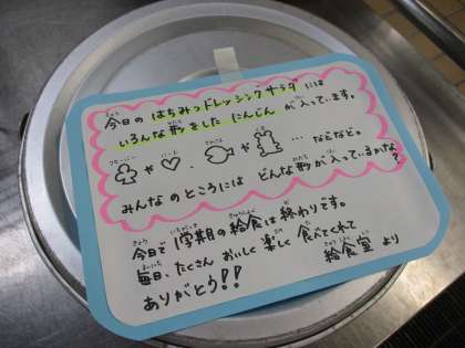1学期の給食は今日で終わりです。毎日、おいしく、楽しく食べてくれた八小のみんなに感謝の気持ちを込めて、サラダのにんじんを様々な形に型抜きしてつくりました。