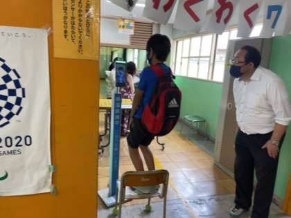 今日は、「わくわくワーク」二日目でした。家庭科室の入室前jには検温と、アルコールの手指消毒を行います。