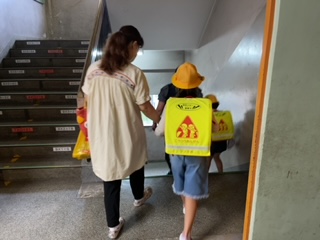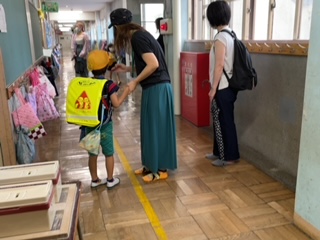 引き渡し訓練は家に帰るまでです。帰る途中に、上からガラスや看板などが落ちてこないか、壁や塀が倒れてこないか危険な箇所を子さんと確かめながら帰ってください。