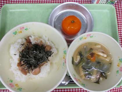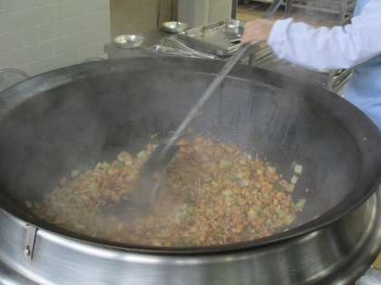 写真は、やきとり丼の具を作っているところです。ぶつ切りにした長ネギとしょうゆ・酒・しょうが・塩で下味をつけた鶏肉をオーブンにかけて、焼き色をつけたあと、たれをわかした回転釜に移して、写真のとおり、長ネギと鶏肉にたれを絡めて仕上げました。食べるときに刻みのりをちらすと、おいしさが一層増します。