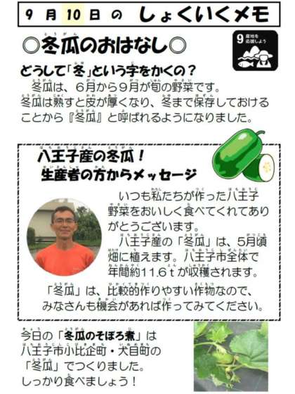今日は、八王子市小比企町と犬目町でとれた「冬瓜」を使って、冬瓜のそぼろ煮をつくりました。冬瓜を出汁で柔らかくなるまで煮た後、しょうゆ・さとう・塩・みりん・酒と油で炒めた鶏ひき肉を加えて煮て、仕上げました。