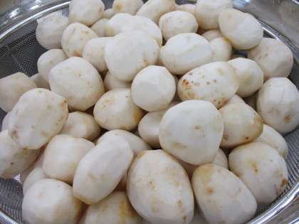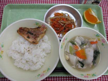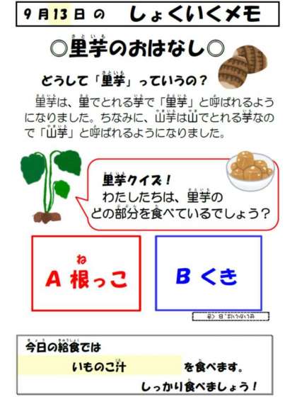 今日は、里芋を使った「芋の子汁」をいただきました。2枚目の写真は、八百屋さんが給食室に届けてくれた千葉県産の里芋です。芋の子汁として調理した里芋は、ほくほくとしており、秋の到来を感じさせるおいしさでした。