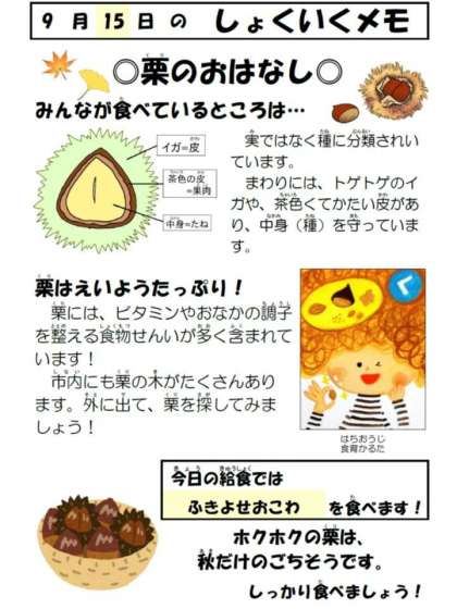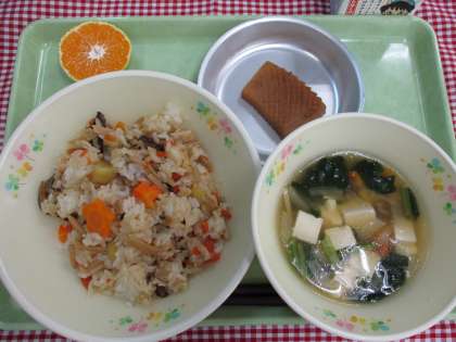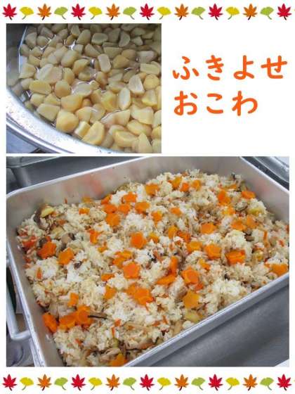 【吹き寄せおこわ】吹き寄せとは、秋風でさまざまな木の葉が吹き寄せられて(集められて)いる様子のことです。今日は、秋の木の葉をイメージして、にんじんをいちょう型やもみじ型に型抜きしました。