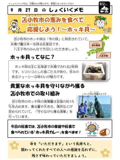 今日は、八王子市の姉妹都市である苫小牧市のホッキ貝を使って「ホッキ貝カレー」をいただきました。いつものカレーとは一味違い、ホッキ貝のシコシコとした食感が味わい深い一品です。