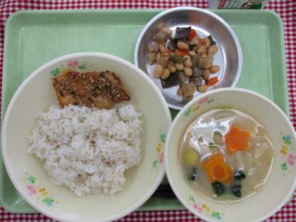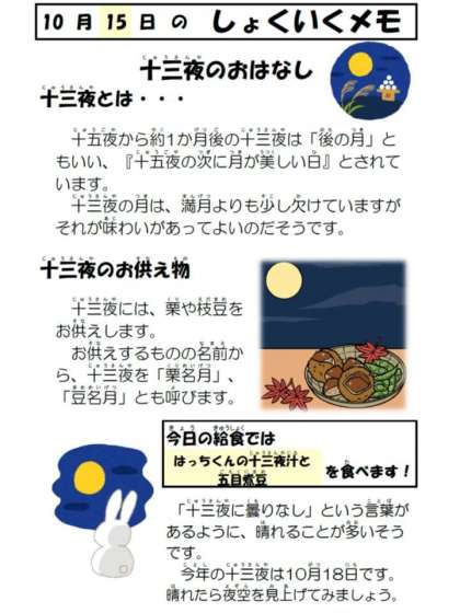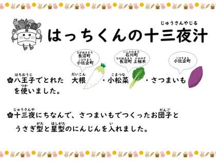 今日は「十三夜」の献立をいただきました。はっちくんの十三夜汁は、八王子産の野菜を使い、さつまいもとでんぷんで作ったお団子で「月」を、うさぎ型のにんじんは「月のうさぎ」をイメージしました。さつまいもの甘さにより、ほっとするやさしい味に仕上がりました。