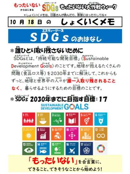 今日から22日までは「もったいない大作戦ウィーク」です。SDGsをふまえて食べ残しを減らすために、事前に各学級で行動目標を考え、その達成を目指して給食をいただきます。