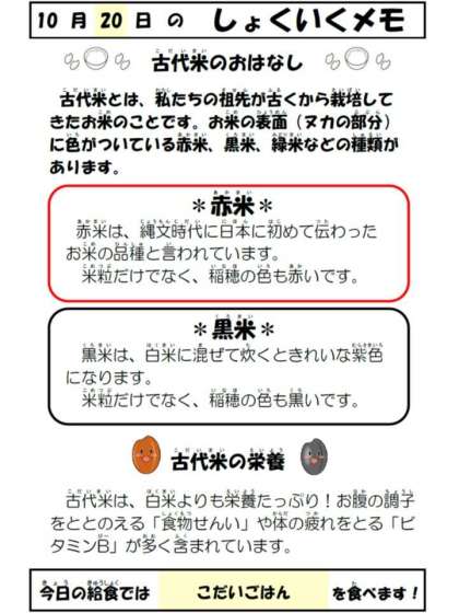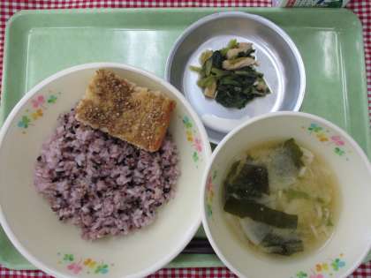 今日は、お米・もち米・赤米・黒米を一緒に炊いた「古代ごはん」をいただきました。古代ごはんを見て、色にびっくりしている子やお赤飯と勘違いしている子もいました。