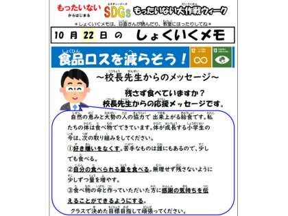最終日の今日は、校長先生から素敵なメッセージをいただきました。そして、八王子市食育ソング「いただきます」の動画を給食時間中に視聴しました。この曲の歌詞の一節、「僕らは命の上に立っている」の言葉の意味を考えながら、もったいない大作戦ウィークが終わった後も、食べることや食べ残しについて考えてほしいと思います。ぜひ、ご家庭でもお子さんと話し合ってみてください。