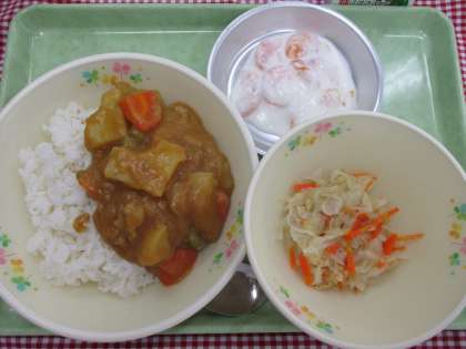 給食の時間、給食のサンプルを見に来た子ども達が「カレー大好き!」と喜んでいました。片付けのときには「見て見て、全部食べたよ!」「おかわりしたよ」「おなかいっぱい」と笑顔がはじけていました。