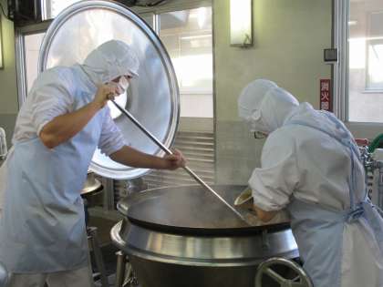 今日の給食は、みんなが大好きな「カレーライス」でした。写真2枚目は、調理員さんがカレーライスを仕上げているところです。左側の調理員さんがカレーをかき混ぜ、右側の調理員さんが手作りのルウをゆっくりと加えています。肉と野菜をじっくり炒めて作ったカレーは、野菜のうまみとあまみがたっぷり。家庭では作れない、学校ならではの味です。
