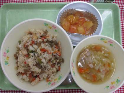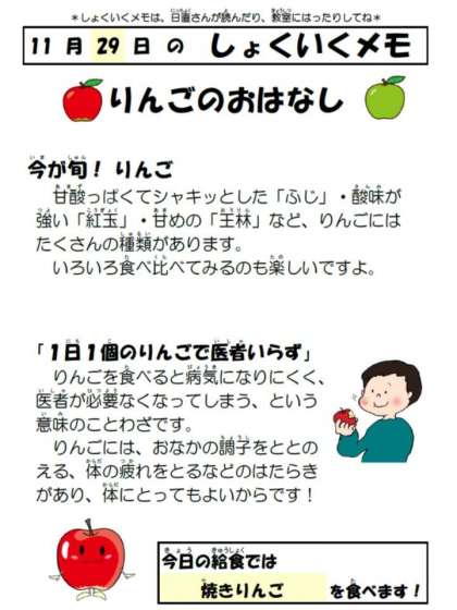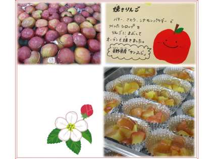 今日は、旬のりんごを「焼きりんご」として味わいました。りんごにシロップ(バター、さとう、シナモンパウダーをわかしたもの)をまぶして、オーブンで焼いた「焼きりんご」は、シナモンの香りが豊かで、甘さが口の中に広がります。