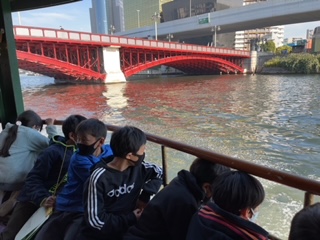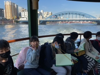 水上バスはスピードをあげて進んでいます。水上バスのモーター音と波の音がハーモニーを奏でています。