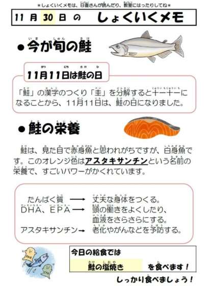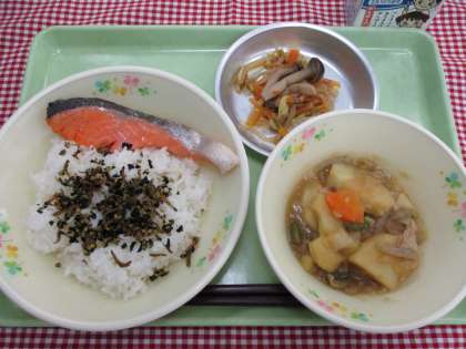 今日は、ちりめんじゃこ・アーモンド・カットわかめ・ごまで作った「ふりかけ」をごはんにかけていただきました。ちりめんじゃこやカットわかめには、カルシウムがたっぷり含まれています。また、旬の鮭にはカルシウムの利用効果を高めるビタミンDが多く含まれています。強くて丈夫な骨をつくるために、バランスよく食べて、太陽の光を浴びながら元気に遊びましょう。