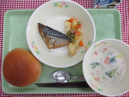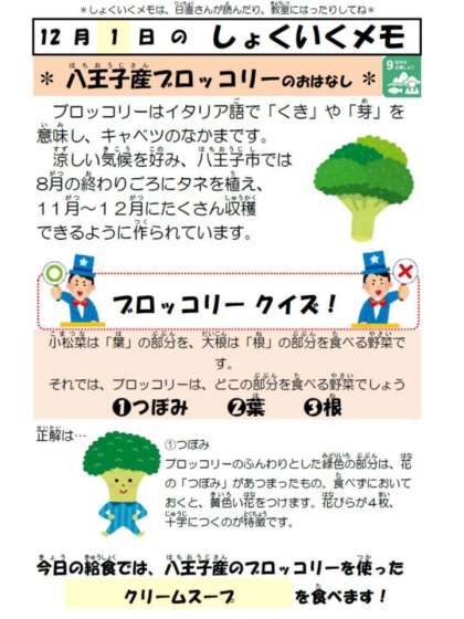 今日は、八王子産(高月町、川町)のブロッコリーが入った「クリームスープ」をいただきました。写真2枚目は、ゆでたブロッコリーを加えてクリームスープを仕上げているところです。にんじんの赤、白菜の黄緑、玉ねぎの白、ブロッコリーの緑がクリームスープを鮮やかに彩りました。