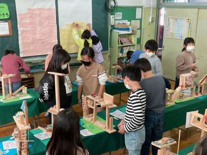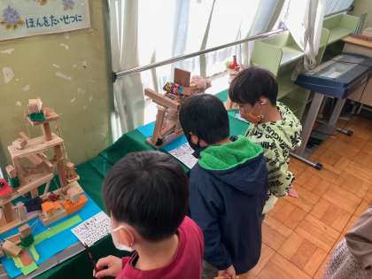 4年生の「ギコトンのひみつきち」の作品を鑑賞しました。4年生の書いた作品の紹介文を読みながら、お気に入りの作品を探して、メッセージカードを書きました。「来年、作るのかな」「これすごい!」「どうやって作ったんだろう」など、上級生の上手な作品を見て、自分でも作ってみたいという気持ちになったようです。