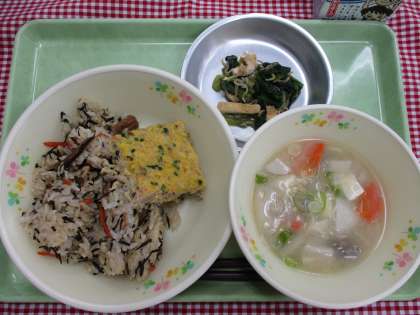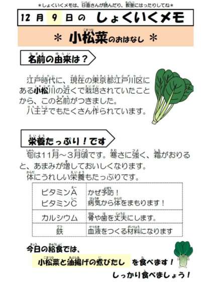 今日は、八王子の上柚木と第八小学校のある石川町でとれた小松菜を使って、「小松菜と油揚げの煮びたし」をつくりました。給食の時間が終わったあと、「今日の給食おいしかった。特にね、小皿のこれ(煮びたし)。」と教えてくれた子がいました。地元の恵みに感謝しながら、味わってもらえたらうれしいです。