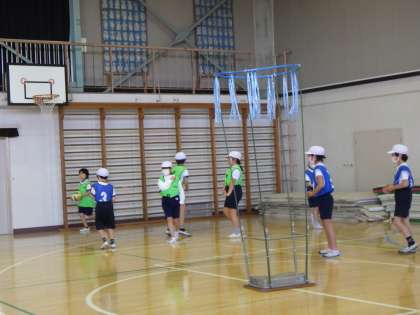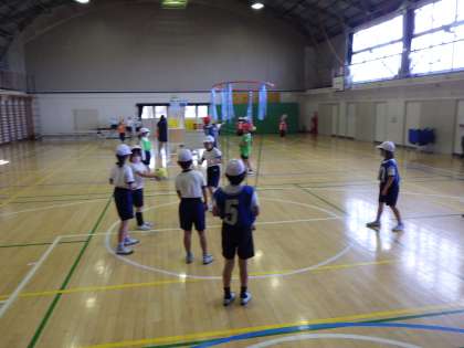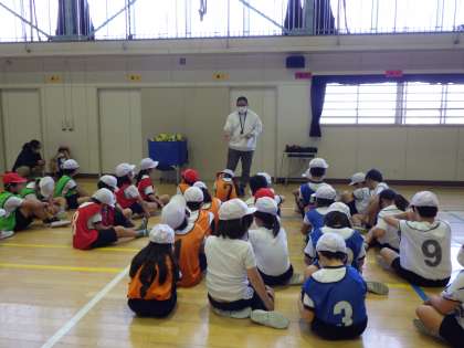 体育の終わりには、みんなで学習のふり返りをしています。「1回目は2点・2回目からは1点にすれば、みんなにボールが回るようになる」など、新たなルールについて話し合うことも、大切な活動です。