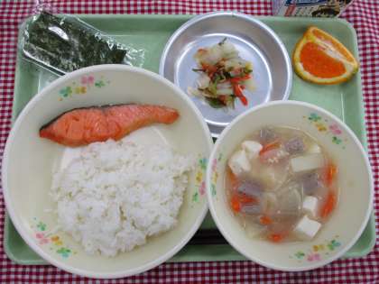 1日目は、給食が始まった明治22年の給食(おにぎり、焼き魚、つけもの)をイメージしました。今から130年ほど前に、お弁当を持ってこられない貧しい子のためにお昼ご飯を出したことが給食の始まりと言われています。