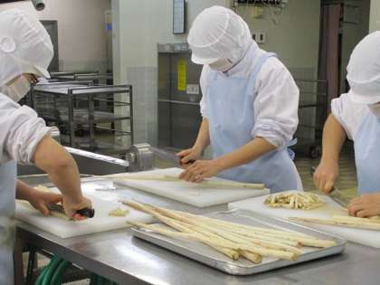 今日は、旬のごぼうを「たたきごぼう」としていただきました。写真は、調理員さんがごぼうを4つ割りにし、4cmくらいの長さに切っているところです。この後、ごぼうをゆで、酢・しょうゆ・さとう・ごま・練りごま・出汁でつくったタレと和えて、仕上げました。