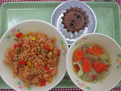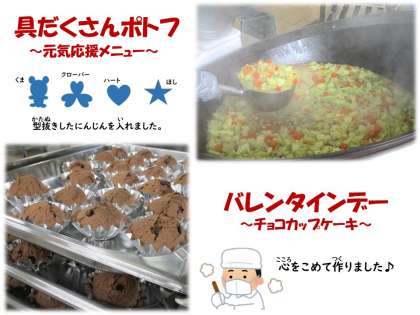 今日は、バレンタインデーです。給食室より、いつもたくさん食べてくれるみなさんへ感謝の気持ちをこめて「ミニチョコカップケーキ」をおくりました。