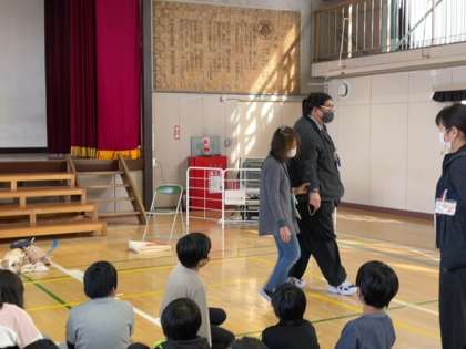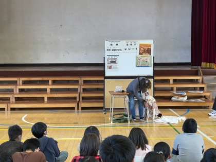 今日、2月22日(火)は4年生が、視覚障がい者の方をゲストティーチャーとして招き、お話を聞きました。盲導犬も一緒に参加しました。視覚障がいがある人にとっては、盲導犬は目の代わりの役割を果たしています。命綱です。