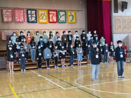 今日は、6年生に対して、1〜5年生が感謝の気持ちを込めて、お礼の言葉や出し物や歌等を披露し、寄せ書きを渡しました。