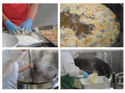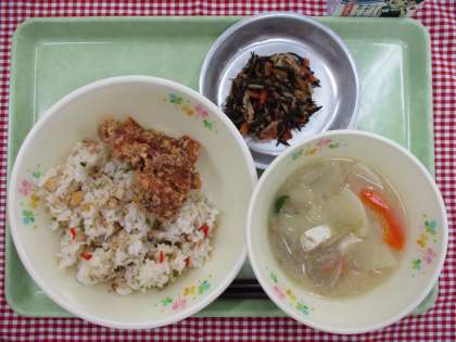 今日は、子どもたちに人気の「鶏のから揚げ」を、苦手な子が多いピーマンとじゃこが入った「じゃこピーごはん」と一緒にいただきました。じゃこピーごはんでは、緑色と赤色のピーマンをみじん切りにして調理したので、苦手な子も食べやすく(挑戦しやすく)なっています。