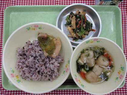 給食のサンプルを見て、見慣れない食材に興味津々の子どもたち。すまし汁に入っている焼き麩を見て「ちくわ?」と尋ねてくれた子もいました。ある学級では、ごはん・桑都みそ焼き・定式幕和え・ろくろ車のすまし汁 全てに、元気よくおかわりしたい!と手を挙げてくれた子が何人もいました。