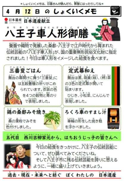 今日の給食をきっかけとして、八王子市のマンホールの絵柄にもなっている「八王子車人形」に興味関心を抱いてくれたら、うれしいです。