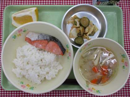 今日は、果物として美生柑をいただきました。皮の色を見て「レモン?」「グレープフルーツ?」「酸っぱい?」とさまざまな声が聞かれました。確かにレモンのように明るい黄金色ですが、この果物はレモンでもグレープフルーツでもなく「美生柑」です。こうした会話をとおして、食べ物の名前をひとつひとつ覚えてくれたらうれしいです。