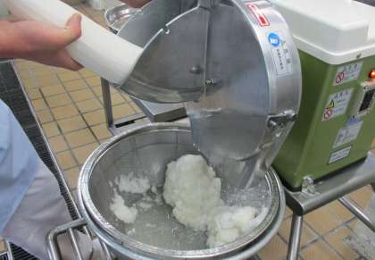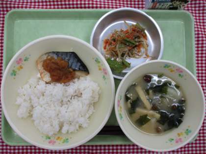 今日は、だいこんをすりおろし、出汁としょうゆ、みりん、さとうで煮たおろしソースを塩こしょうして焼いたさばにかけていただきました。写真は、だいこんを野菜切り器でおろしているところです。「優しい力ですりおろすと大根の苦みが抑えられるんですよ」と教えてくれた調理員さん。先生方や子どもたちにも好評で、「ごはんのうえにおろしソースをかけて食べた♪」「また出して〜」と伝えてくれた子がいました。