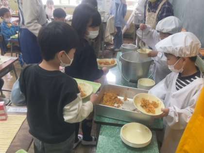 配膳も給食当番が手際よく、丁寧に行います。給食をもらいに行く児童も行儀よく並んでもらいに行きます。