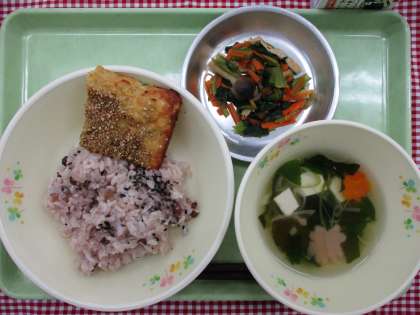 今日は、1年生の入学祝いと2年生から6年生のみなさんの進級祝いとして、赤飯や桜型のかまぼこやにんじんを浮かべたお祝いすまし汁をいただきました。