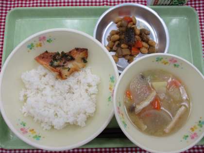 赤魚の薬味焼きは、塩・しょうが・にんにく・こねぎ・しょうゆ・ごま油・七味唐辛子で下味をつけた赤魚をオーブンで焼いて作りました。ごはんがすすむ味で、子どもたちにも好評でした。