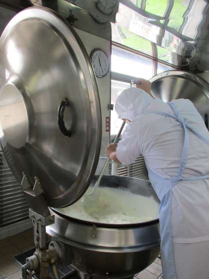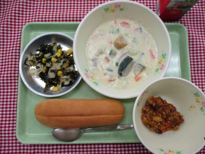 今日は、旬のかぼちゃを「パンプキンシチュー」としていただきました。写真は、調理員さんがパンプキンシチューを作っているところです。八王子でとれたかぼちゃを一度蒸してから、シチューに加えて仕上げました。