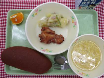 コーンと卵のスープは、やさしい甘さの、のどごしなめらかなスープです。玉ねぎ、コーン、クリームコーン、卵を使って作りました。おかわりをしている子どもたちの姿も見受けられ、多くのクラスで食缶は空っぽになっていました。