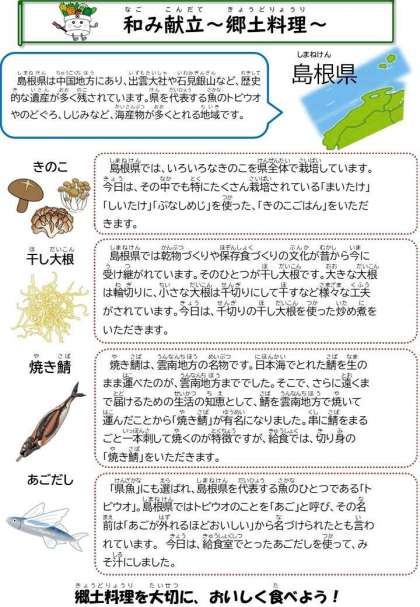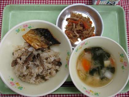 令和4年10月4日の給食 公開日 2022/10/04 更新日 2022/10/04 今日の献立 🌸献立🌸 きのこごはん 焼き鯖 切り干し大根の炒め煮 あごだしのみそ汁 牛乳 今日は、和み献立の日です。今回は、島根県の郷土料理をいただきました。あご(トビウオ)でとった出汁は、とてもおいしく、いつもと違う味わいを楽しめるみそ汁に仕上がりました。 ☆きょうの八王子産☆ しいたけ こまつな いいね(0)