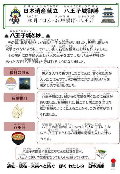 令和4年10月5日の給食 公開日 2022/10/05 更新日 2022/10/05 今日の献立 🌸献立🌸 秋月ごはん 石垣揚げ 八王子汁 ゆかり和え 牛乳 今日は、八王子の歴史や文化にちなんだ給食として「八王子城御膳」をいただきました。それぞれの料理については、2枚目の画像、食育メモをご覧ください。 ☆きょうの八王子産☆ かぶ しいたけ こまつな いいね(0)