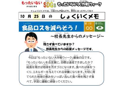 もったいない大作戦ウィーク5日目の今日は、校長先生からあたたかいメッセージをいただきました。食育メモをご覧ください。