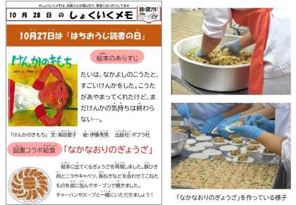 今日は、図書とのコラボ給食です。コラボした絵本は、ポプラ社「けんかのきもち」(文・柴田愛子 絵・伊藤秀男)です。この絵本に登場するぎょうざをモチーフに、給食では「なかなおりのぎょうざ」としていただきました。