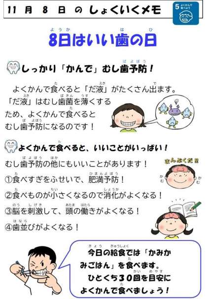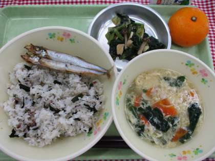 今日、11月8日「いい歯の日」に合わせて、かむことを意識して食べられるように、じゃことわかめが入った「かみかみごはん」と丸ごと食べられる「焼きししゃも」の献立をいただきました。