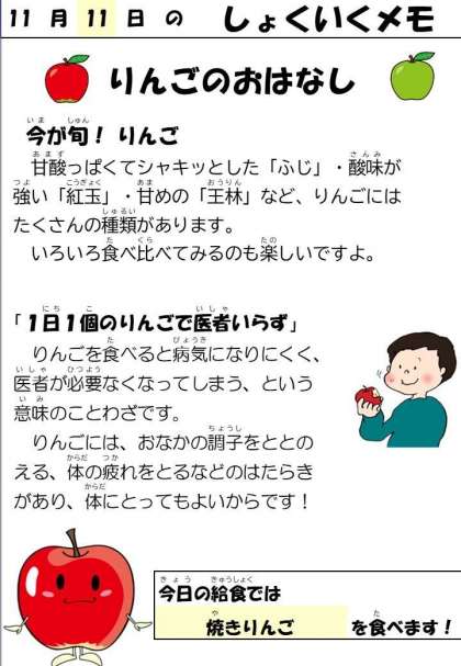 令和4年11月11日の給食 公開日 2022/11/14 更新日 2022/11/14 今日の献立 🌸献立🌸 とりごぼうピラフ 野菜スープ 焼きりんご 牛乳 今日は、旬のりんごを「焼きりんご」としていただきました。使用したりんごは、青森県産のシナノスイートです。加熱したバター、さとう、シナモンとまぶし、カップに入れて焼き上げました。ほんのりとした甘さがおいしい旬のデザートです。 ☆きょうの八王子産☆ キャベツ いいね(0)