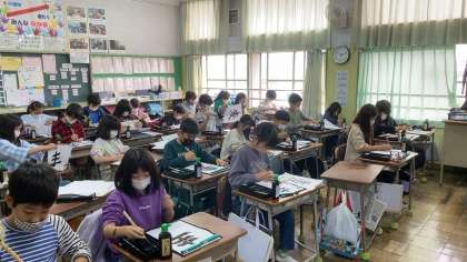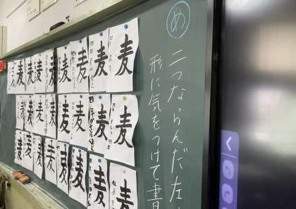 4年生が書写の学習で「麦」の字を書きました。左の二つのはらいの形に気を付けて、手本をよく見て丁寧に書きました。書写では、始筆と終筆の筆先の向きに気を付けて書くように指導を重ねてきましたが、その書き方が定着してきて堂々とした線を書くことができるようになってきました。文字を書いているときは、しっかり集中して静かに活動に取り組むことができました。